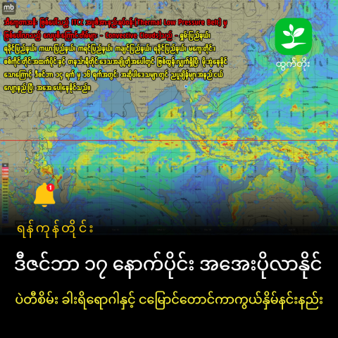 ယခု ၁ ပတ်အတွင်း ရန်ကုန်တိုင်းတွင် ဒီဇင်ဘာ ၁၄ ရက်မှ ၁၆ ရက်နေ့အထိ တိမ်အနည်းငယ်မှ တိမ်အသင့်အတင့်ဖြစ်ထွန်းနိုင်ပြီး မိုးရွာရန်မရှိ မိုးအုံ့နေပြီး နေ့/ည အပ... ဆက်ရန်