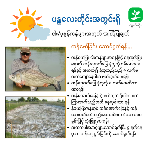 - ကန်ဖော်ပြီး ငါးကန်များအနေဖြင့် ရေထုတ်ပြီးနောက် ကန်အောက်ခြေ နွံထုကို စစ်ဆေးပေးရန်နှင့် အကယ်၍ နွံထုထည်သည် ၈ လက်မထက်ကျော်နေပါက ဖယ်ထုတ်ပေးရန်၊