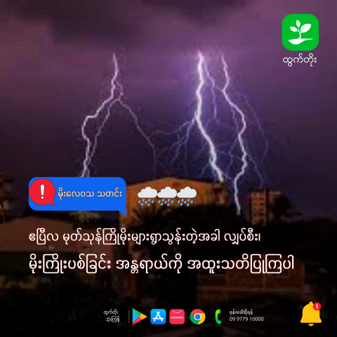 ၂၀၂၅ ဧပြီလမှာ မုတ်သုန်ကြိုမိုးများရွာသွန်းလာတဲ့အခါ လေမိုး လျှပ်စီးမိုးကြိုး မိုးကြိုးပစ်ခြင်း အန္တရာယ်တွေကို အထူးသတိပြုကြပါ။
