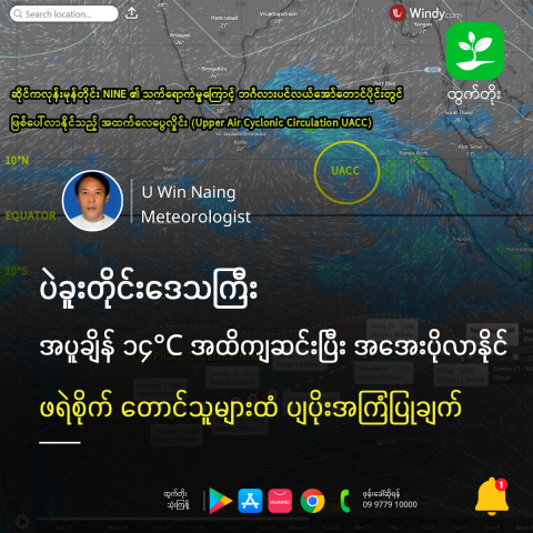 ·          အိန္ဒိယသမုဒ္ဒရာတောင်ဘက်ခြမ်းပင်လယ်ပြင်မှာ အပူပိုင်းမုန်တိုင်း NINE ဖြစ်ပေါ်နေပြီး၊ အနောက်ဘက်သို့ဆက်လက်ရွေ့လျားကာ ဒီဇင်ဘာ ၂၈ ရက်မှ စတင်ပြီဂ ဆိုင်ကလုန်းမုန်တိုင်းဖြစ်လာနိုင်ကြောင်းတွေ့ရပါတယ်။ မုန်တိုင်း NINE ရဲ့သက်ရောက်မှုကြောင့် ဘင်္ဂလားပင်လယ်အော်တောင်ပိုင်းမှာ လေပွေလှိုင်းတခုဖြစ်လာနိုင်သည်မှအပ မုန်တိုင်းဖြစ်လာနိုင်မည်မဟုတ်ပါ။