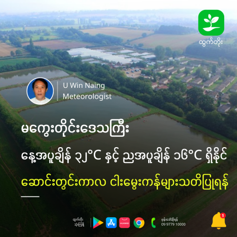 ယခုနှစ်ဆောင်းရာသီကာလသည် ယခင်နှစ်ထက် အပူချိန်ကျဆင်းသည်ကို ကြုံတွေ့နေရပါသည်။ ထို့ကြောင့် ငါးမွေးကန်၏ ရေအပူချိန်သည်လည်း ကျဆင်းတတ်ပါသည်။ နှင်းကျသောဒေသရှိ ငါးမွေးကန်များသည် မနက်ပိုင်း နှင်းများကျရောက်ပြီး ကန်ရေမျက်နှာပြင် တင်းနေတတ်ပါသည်။ အဆိုပါအခြေအနေတွင် ကန်ရေ၏ ဓါတုဆိုင်ရာ များစွာပြောင်းလဲလာပြီး၊ ကောင်းကျိုးထက် ဆိုးကျိုးများ ပိုမိုဖြစ်စေတတ်ပါသည်။ ဒါ့ကြောင့် မွေးမြူရေးနဲ့ပတ်သတ်ပြီး ဆွေးနွေးလိုပါက ကောစင်တာ နံပါတ် ၀၉- ၉၇၇၉၁၀၀၀၀ သို့ ဆက်သွယ်နိုင်ပါသည်။