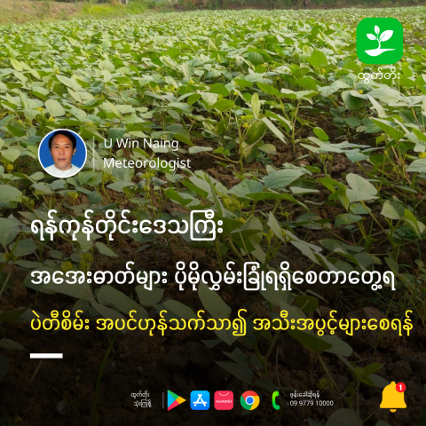 · ယခု ၁ ပတ်အတွင်း - ရန်ကုန်တိုင်းတောင်ပိုင်းဒေသများဖြစ်သည့် သံလျှင်၊ ကျောက်တန်း၊ ဝါးဘလောက်သောက်၊ ခရမ်း၊ သုံးခွ စသည့်မြို့နယ်များတွင် အမြင့်ဆုံးအပူချိန် ၃၁°C နှင့် အနိမ့်ဆုံးအပူချိန် ၁၇°C ရှိနိုင်ပါမယ်။