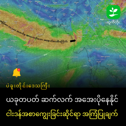 ·          အိန္ဒိယနိုင်ငံမြောက်ပိုင်းကိုဖြတ်သန်းတိုက်ခတ်လာနိုင်မည့် အမြင့်ပေ ၁၀၀၀၀ အထက်မှ အားကောင်းသော အနောက်-အနောက်မြောက်လေစီးကြောင်း နှင့်အတူ အေးမြခြောက်သွေ့သောလေအေးများ မြန်မာနိုင်ငံအထက်ပိုင်းသို့ ဝင်ရောက်လာနိုင်သည့်အတွက် ယခုတပတ်အတွင်းဆက်လက်၍ အအေးပိုနေနိုင်ပြီး မိုးရွာနိုင်သည့်အခြေအနေမရှိပါ။