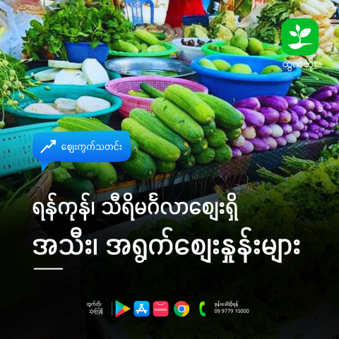 သီးနှံပေါက်စျေးနှုန်းများသည် အချိန်၊ဒေသကိုလိုက်၍ စျေးနှုန်းအပြောင်းအလဲများ ရှိနိုင်ပါသည်။ ထွက်တိုးတောင်သူအကြံပေးဖုန်း - ၀၉၉၇၇၉၁၀၀၀၀ သို့ ဆက်သွယ်ပြီးလည်း မေးမြန်းစုံစမ်းနိုင်ပါသည်။