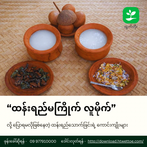 စိုက်ပျိုးရေးနှင့် ပတ်သတ်သော အခက်အခဲများကို တိုင်ပင်ဆွေးနွေး အကြံဥာဏ်ရယူလိုပါက ထွက်တိုး တောင်သူအကြံပေးဖုန်း- ၀၉၉၇၇၉၁၀၀၀၀ ကို ဆက်သွယ်နိုင်ပါတယ် သို့မဟုတ် ထွက်တိုးကို follow, Like, Share နှင့် Download လုပ်ထားပြီး -http://download.htwettoe.com/ ထွက်တိုးမေးဖြေကဏ္ဍတွင်ဝင်ရောက်မေးမြန်း နိုင်ပါ ကြောင်းသတင်းကောင်းပါလိုက်ပါတယ်။