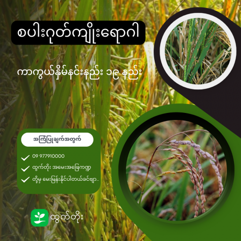 - စပါးတွင် အဓိကကျရောက်သည့် ရောဂါဖြစ်သည်။ မှိုကြောင့်ဖြစ်ပြီး ပင်ပွားစည်းချိန်တွင် အရွက်၊ ပင်စည် နှင့် ပန်းပွင့်များတွင် ကျရောက်ပြီး စပါးအထွက်ကို လျှော့စေပါသည်။